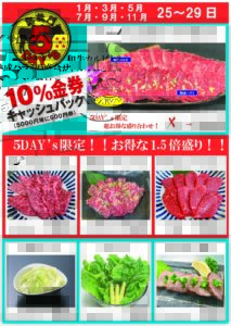 肉の日5DAYS! 2026年1月23日新メニューgaisenmon Tweet 凱旋門のイベント「肉の日5DAYS」を今月も開催します! 25日~29日の奇数月限定5日間です。 【特典】 ①お会計金額ごとに10%分の金券をキャッシュバック! (例えば、5,000円~9,999円のお食事で500円券、10,000円~14,999円で千円券のお渡し) 使えるのは次回のお食事から、金券の有効期限は翌々月15日までとなります ➁5DAYSの限定メニュー、お得な価格でご提供 凱旋門の人気メニューや、肉の日限定盛合せも登場しますのでお楽しみに!